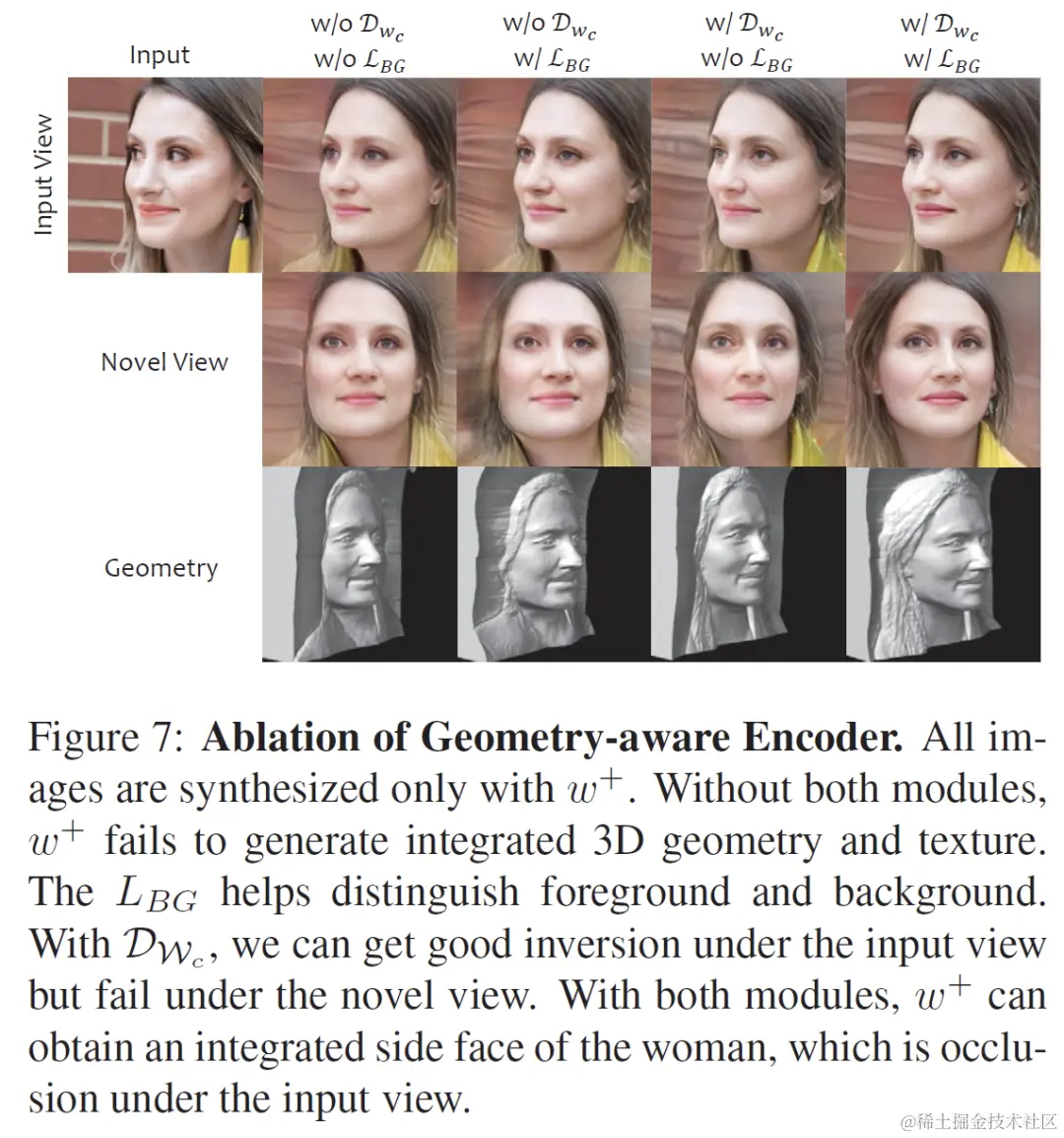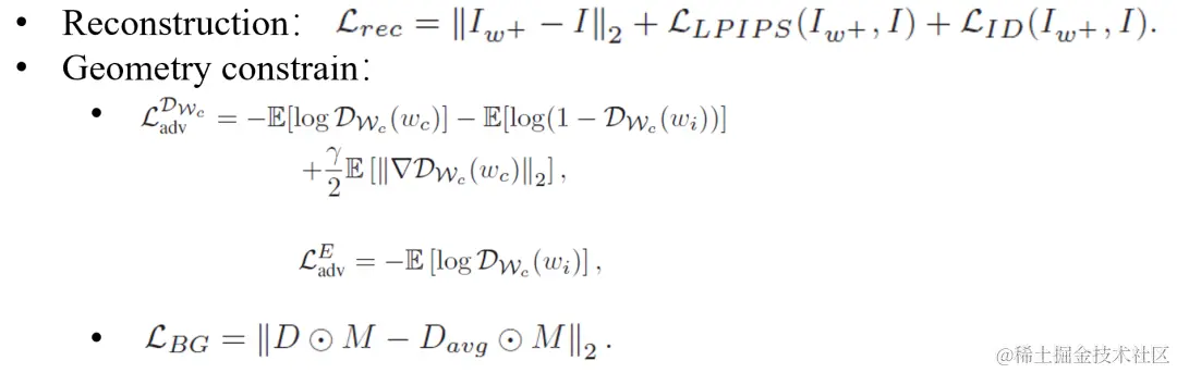 因此,我们第一步构建了一个 geometry-aware encoder,除了,LPIPS,ID 等重建损失,我们提出使用canonical latent space上的对抗损失,用于隐式地拉近重建的 latent space 和 canonical latent space 之间的分布,另一方面我们显式地正则 canonical view 下的背景深度,两者的共同约束让我们避免在训练中过拟合到输入视角,产生平坦几何,而是获得一个可以生成完整的几何的 latent。相关的损失函数定义如下。