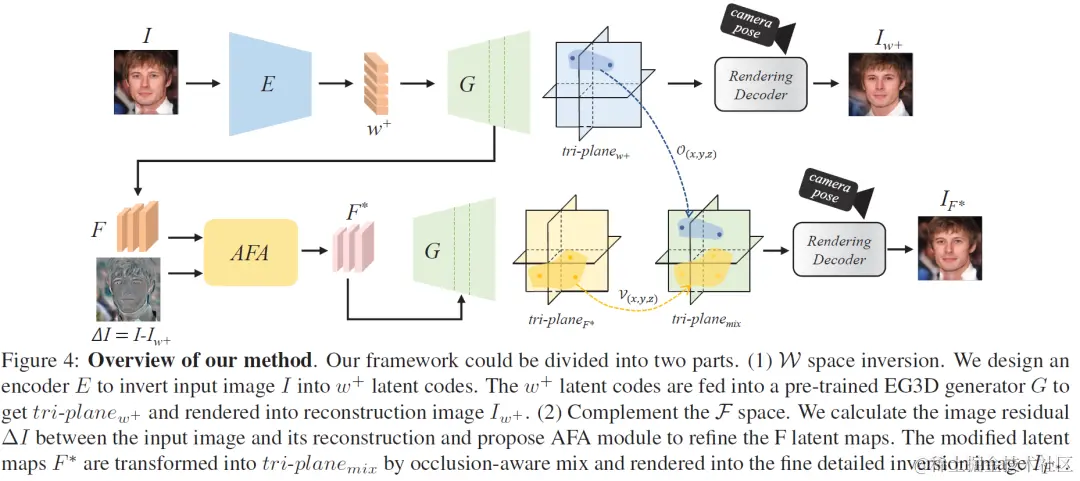 因此,我们设计了一个 encoder-based 的框架来解决 3D GAN Inversion。首先探究了 3D GAN 中 canonical space (标准空间)的性质,并以此提出了 geometry-aware (几何感知)的 encoder,以及 Adaptive Feature Align (AFA,自适应特征对齐)模块提升细节纹理,和 mix tri-plane (遮挡感知融合)模块来处理遮挡关系,从而达到了高效高质量的重建和一致的编辑效果。