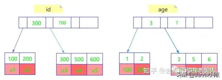 假设有一张User表(id,age,name,address),其中有id和age两个字段,其中id是主键,age是普通索引,有几行数据u1-u5的(id,age)的值是(100,1)、(200,2)、(300,3)、(500,5)和(600,6) ,此时的两棵树的示例如下: