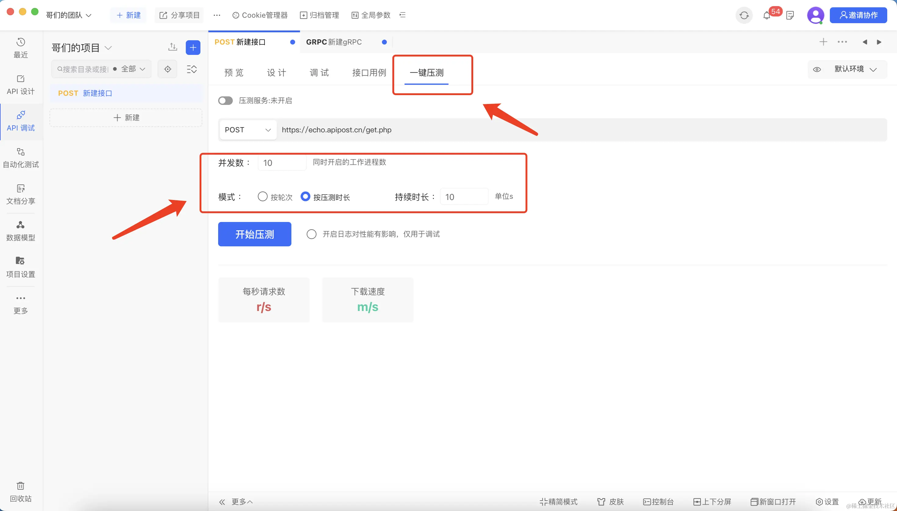 选择一键压测,开启压测服务,输入并发数、压测模式即可开始测试。
