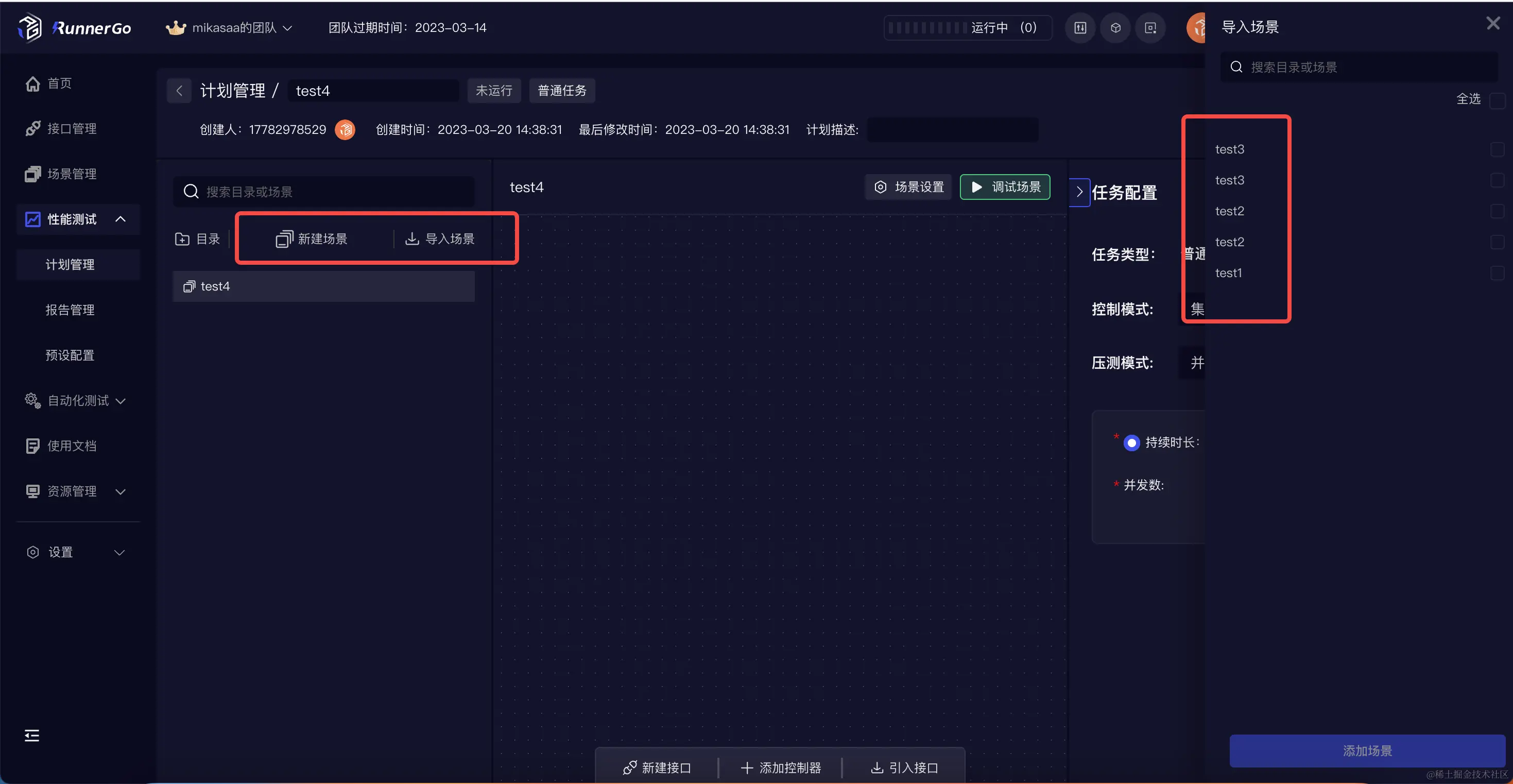 在计划管理中,需要给该计划下的每一个场景设置任务配置。 RunnerGo支持并发模式、错误率模式、阶梯模式、响应时间模式、每秒应答数模式等多种压测模式,模拟真实场景。