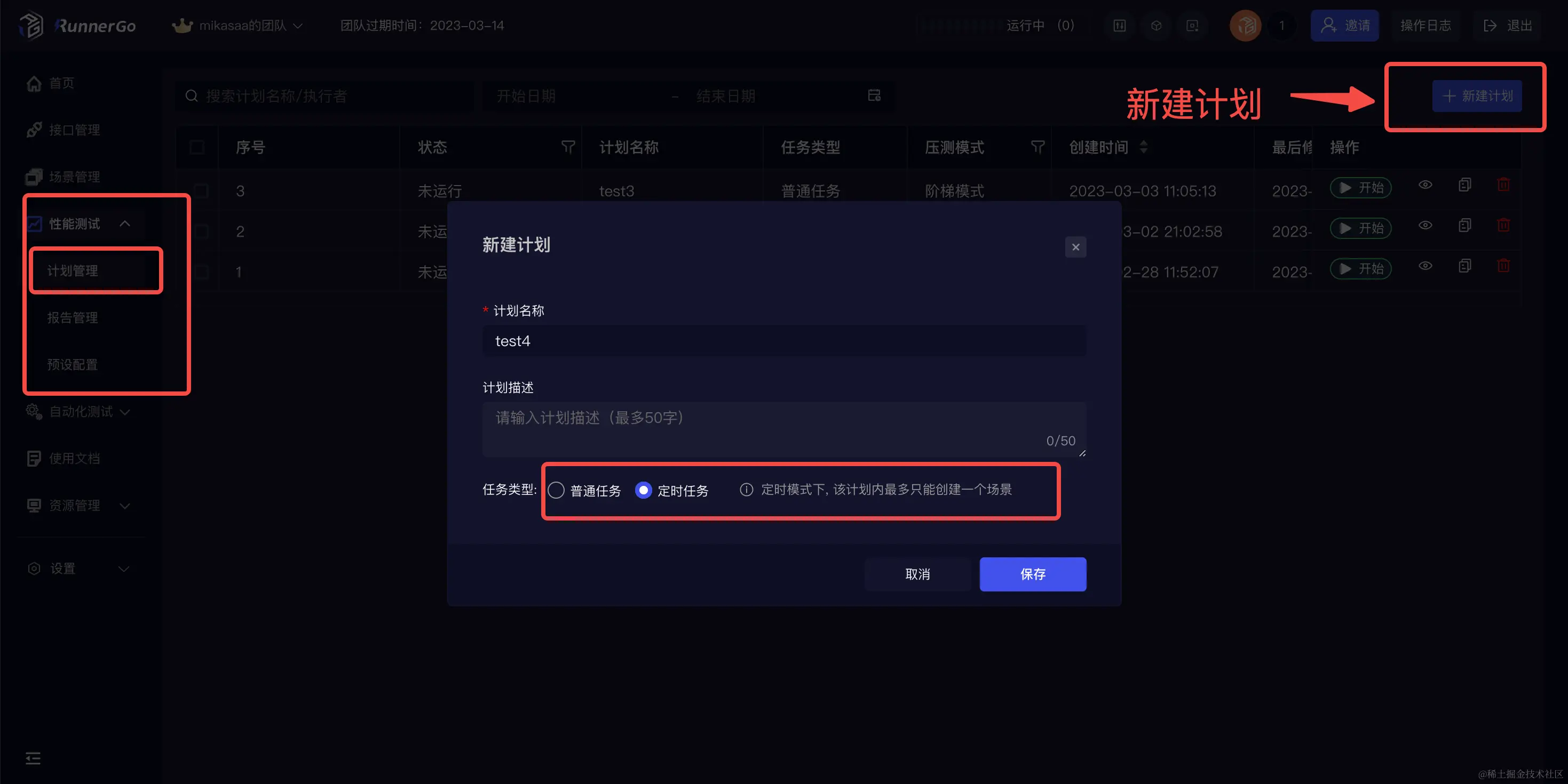 在左侧导航栏中,选择“性能测试”,点击“计划管理”进入计划管理界面,点击右上角新建计划来新建测试计划。任务类型选择后不可再更改。定时模式下, 该计划内最多只能创建一个场景。
