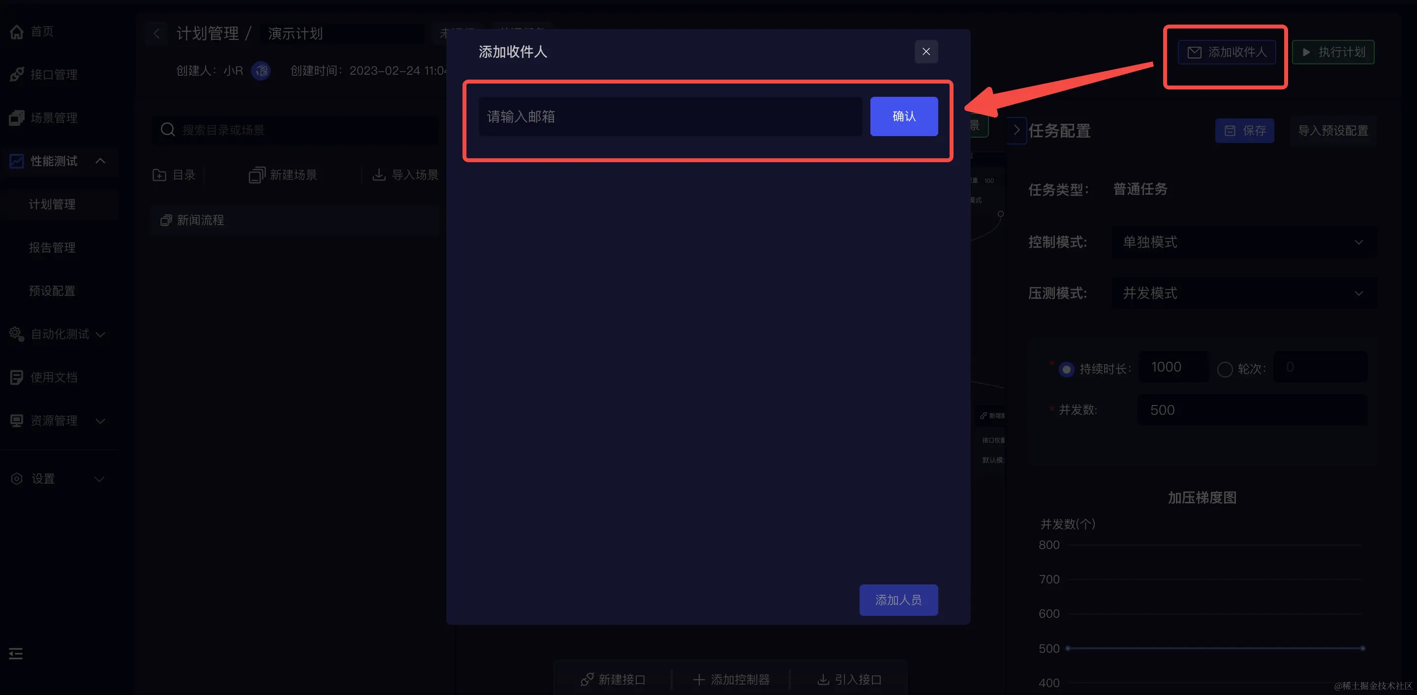 可以在右上角添加测试报告收件人,该计划下所有场景的测试结束后测试报告会通过邮件发给收件人。