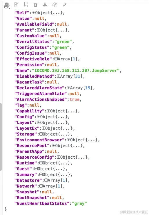 {"Self":{"Type":"VirtualMachine","Value":"vm-389"},"Value":null,"AvailableField":null,"Parent":{"Type":"Folder","Value":"group-v341"},"CustomValue":null,"OverallStatus":"green","ConfigStatus":"green","ConfigIssue":null,"EffectiveRole":[-2],"Permission":null,"Name":"IDCOMD_192.168.110.191_CentOS6.10.X64.Template","DisabledMethod":["Destroy_Task","UnregisterVM","UnmountToolsInstaller","AnswerVM","UpgradeVM_Task","UpgradeTools_Task","UpgradeToolsFromImage_Task","TurnOffFaultToleranceForVM_Task","MakePrimaryVM_Task","TerminateFaultTolerantVM_Task","DisableSecondaryVM_Task","EnableSecondaryVM_Task","CreateSecondaryVM_Task","CreateSecondaryVMEx_Task","StopRecording_Task","StopReplaying_Task","CustomizeVM_Task","MarkAsTemplate","ResetGuestInformation","ExportVm","PowerOnVM_Task","MarkAsVirtualMachine"],"RecentTask":null,"DeclaredAlarmState":[{"Key":"alarm-10.vm-389","Entity":{"Type":"VirtualMachine","Value":"vm-389"},"Alarm":{"Type":"Alarm","Value":"alarm-10"},"OverallStatus":"gray","Time":"2019-08-02T02:03:33.547846Z","Acknowledged":false,"AcknowledgedByUser":"","AcknowledgedTime":null,"EventKey":0},{"Key":"alarm-11.vm-389","Entity":{"Type":"VirtualMachine","Value":"vm-389"},"Alarm":{"Type":"Alarm","Value":"alarm-11"},"OverallStatus":"gray","Time":"2019-08-02T02:03:33.554847Z","Acknowledged":false,"AcknowledgedByUser":"","AcknowledgedTime":null,"EventKey":0},{"Key":"alarm-2.vm-389","Entity":{"Type":"VirtualMachine","Value":"vm-389"},"Alarm":{"Type":"Alarm","Value":"alarm-2"},"OverallStatus":"gray","Time":"2019-08-02T02:03:33.592849Z","Acknowledged":false,"AcknowledgedByUser":"","AcknowledgedTime":null,"EventKey":0},{"Key":"alarm-23.vm-389","Entity":{"Type":"VirtualMachine","Value":"vm-389"},"Alarm":{"Type":"Alarm","Value":"alarm-23"},"OverallStatus":"gray","Time":"2019-08-02T02:03:33.597849Z","Acknowledged":false,"AcknowledgedByUser":"","AcknowledgedTime":null,"EventKey":0},{"Key":"alarm-26.vm-389","Entity":{"Type":"VirtualMachine","Value":"vm-389"},"Alarm":{"Type":"Alarm","Value":"alarm-26"},"OverallStatus":"gray","Time":"2019-08-02T02:03:33.601849Z","Acknowledged":false,"AcknowledgedByUser":"","AcknowledgedTime":null,"EventKey":0},{"Key":"alarm-30.vm-389","Entity":{"Type":"VirtualMachine","Value":"vm-389"},"Alarm":{"Type":"Alarm","Value":"alarm-30"},"OverallStatus":"gray","Time":"2019-08-02T02:03:33.60685Z","Acknowledged":false,"AcknowledgedByUser":"","AcknowledgedTime":null,"EventKey":0},{"Key":"alarm-49.vm-389","Entity":{"Type":"VirtualMachine","Value":"vm-389"},"Alarm":{"Type":"Alarm","Value":"alarm-49"},"OverallStatus":"gray","Time":"2019-08-02T02:03:33.62285Z","Acknowledged":false,"AcknowledgedByUser":"","AcknowledgedTime":null,"EventKey":0},{"Key":"alarm-50.vm-389","Entity":{"Type":"VirtualMachine","Value":"vm-389"},"Alarm":{"Type":"Alarm","Value":"alarm-50"},"OverallStatus":"gray","Time":"2019-08-02T02:03:33.625851Z","Acknowledged":false,"AcknowledgedByUser":"","AcknowledgedTime":null,"EventKey":0},{"Key":"alarm-51.vm-389","Entity":{"Type":"VirtualMachine","Value":"vm-389"},"Alarm":{"Type":"Alarm","Value":"alarm-51"},"OverallStatus":"gray","Time":"2019-08-02T02:03:33.628851Z","Acknowledged":false,"AcknowledgedByUser":"","AcknowledgedTime":null,"EventKey":0},{"Key":"alarm-59.vm-389","Entity":{"Type":"VirtualMachine","Value":"vm-389"},"Alarm":{"Type":"Alarm","Value":"alarm-59"},"OverallStatus":"gray","Time":"2019-08-02T02:03:33.634851Z","Acknowledged":false,"AcknowledgedByUser":"","AcknowledgedTime":null,"EventKey":0},{"Key":"alarm-6.vm-389","Entity":{"Type":"VirtualMachine","Value":"vm-389"},"Alarm":{"Type":"Alarm","Value":"alarm-6"},"OverallStatus":"green","Time":"2019-06-28T06:59:39.478Z","Acknowledged":false,"AcknowledgedByUser":"","AcknowledgedTime":null,"EventKey":0},{"Key":"alarm-65.vm-389","Entity":{"Type":"VirtualMachine","Value":"vm-389"},"Alarm":{"Type":"Alarm","Value":"alarm-65"},"OverallStatus":"gray","Time":"2019-08-02T02:03:33.643852Z","Acknowledged":false,"AcknowledgedByUser":"","AcknowledgedTime":null,"EventKey":0},{"Key":"alarm-67.vm-389","Entity":{"Type":"VirtualMachine","Value":"vm-389"},"Alarm":{"Type":"Alarm","Value":"alarm-67"},"OverallStatus":"gray","Time":"2019-08-02T02:03:33.646852Z","Acknowledged":false,"AcknowledgedByUser":"","AcknowledgedTime":null,"EventKey":0},{"Key":"alarm-7.vm-389","Entity":{"Type":"VirtualMachine","Value":"vm-389"},"Alarm":{"Type":"Alarm","Value":"alarm-7"},"OverallStatus":"green","Time":"2019-06-28T06:59:39.478Z","Acknowledged":false,"AcknowledgedByUser":"","AcknowledgedTime":null,"EventKey":0},{"Key":"alarm-95.vm-389","Entity":{"Type":"VirtualMachine","Value":"vm-389"},"Alarm":{"Type":"Alarm","Value":"alarm-95"},"OverallStatus":"gray","Time":"2019-08-02T02:03:33.666853Z","Acknowledged":false,"AcknowledgedByUser":"","AcknowledgedTime":null,"EventKey":0}],"TriggeredAlarmState":null,"AlarmActionsEnabled":true,"Tag":null,"Capability":{"SnapshotOperationsSupported":true,"MultipleSnapshotsSupported":true,"SnapshotConfigSupported":true,"PoweredOffSnapshotsSupported":true,"MemorySnapshotsSupported":true,"RevertToSnapshotSupported":true,"QuiescedSnapshotsSupported":true,"DisableSnapshotsSupported":false,"LockSnapshotsSupported":true,"ConsolePreferencesSupported":false,"CpuFeatureMaskSupported":true,"S1AcpiManagementSupported":true,"SettingScreenResolutionSupported":false,"ToolsAutoUpdateSupported":false,"VmNpivWwnSupported":true,"NpivWwnOnNonRdmVmSupported":true,"VmNpivWwnDisableSupported":true,"VmNpivWwnUpdateSupported":true,"SwapPlacementSupported":true,"ToolsSyncTimeSupported":true,"VirtualMmuUsageSupported":true,"DiskSharesSupported":true,"BootOptionsSupported":true,"BootRetryOptionsSupported":true,"SettingVideoRamSizeSupported":true,"SettingDisplayTopologySupported":false,"RecordReplaySupported":true,"ChangeTrackingSupported":true,"MultipleCoresPerSocketSupported":true,"HostBasedReplicationSupported":true,"GuestAutoLockSupported":true,"MemoryReservationLockSupported":true,"FeatureRequirementSupported":true,"PoweredOnMonitorTypeChangeSuppo
