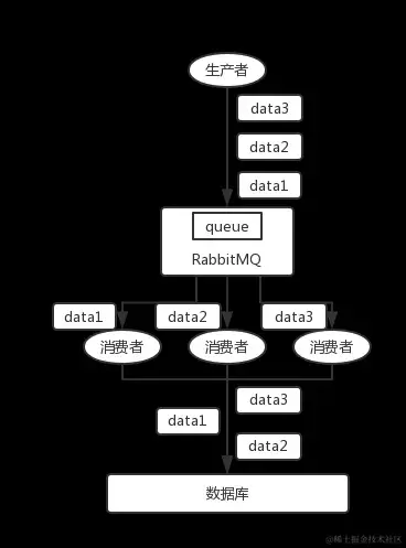 - RabbitMQ:一个 queue,多个 consumer。比如,生产者向 RabbitMQ 里发送了三条数据,顺序依次是 data1/data2/data3,压入的是 RabbitMQ 的一个内存队列。有三个消费者分别从 MQ 中消费这三条数据中的一条,结果消费者2先执行完操作,把 data2 存入数据库,然后是 data1/data3。这不明显乱了。