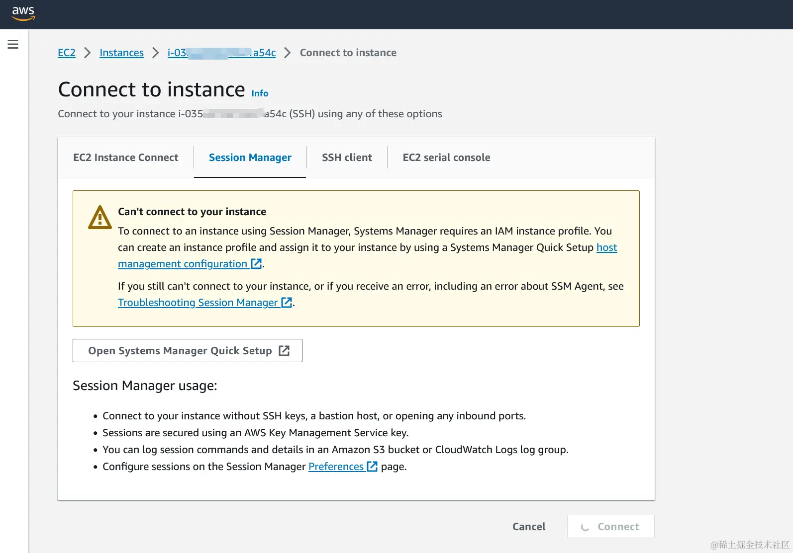 起初我们没有设置好权限时,我们默认时无法通过Session Manager直接访问EC2的