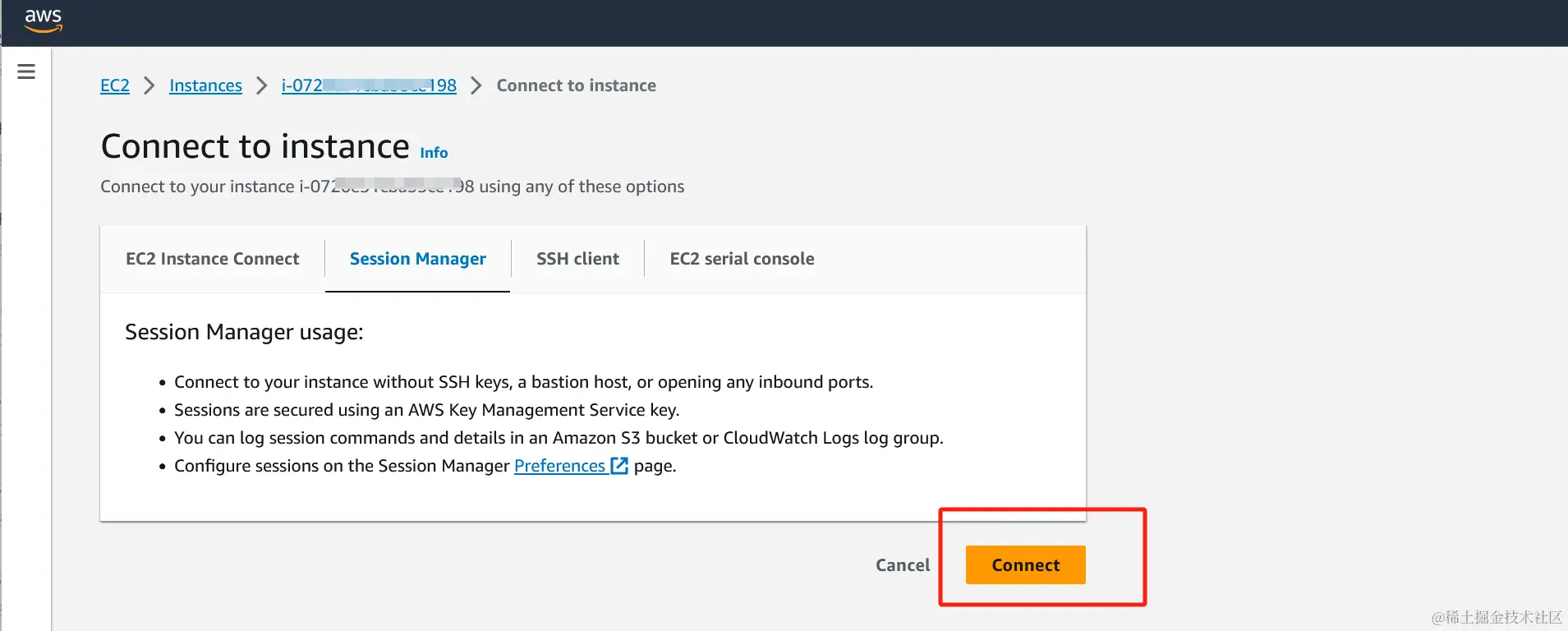 当我们在AWS上开启一个EC2后,我们可以直接点击EC2控制台的connect按钮查看远程连接方式