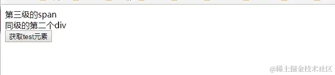 两个class都包含“test”的元素,一个在文档树的前面,但是它在第三级,另一个在文档树的后面,但它在第一级,通过querySelector获取元素时,它通过深度优先搜索,拿到文档树前面的第三级的元素。运行结果: