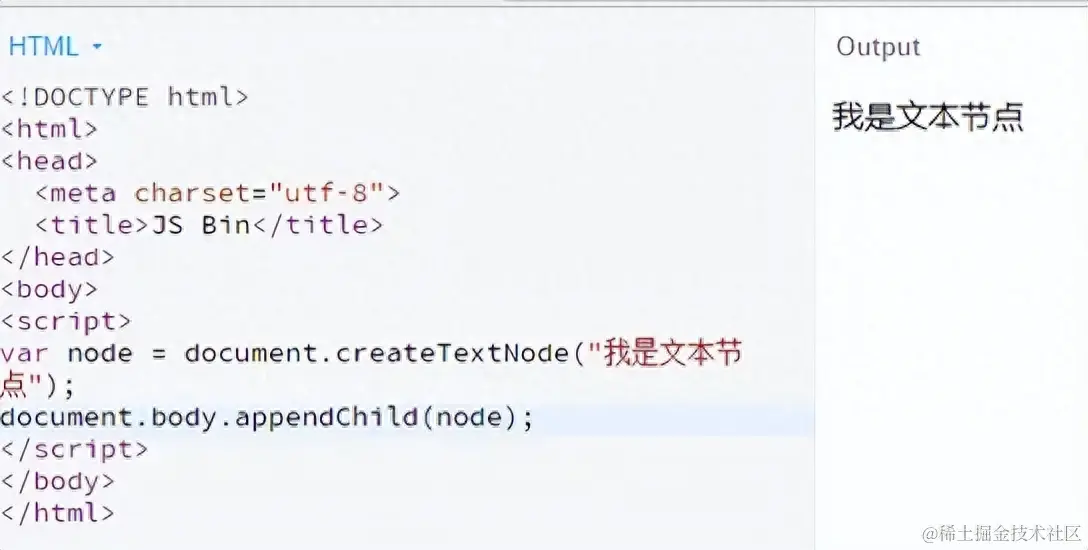 createTextNode接收一个参数,这个参数就是文本节点中的文本,和createElement一样,创建后的文本节点也只是独立的一个节点,同样需要appendChild将其添加到HTML文档树中