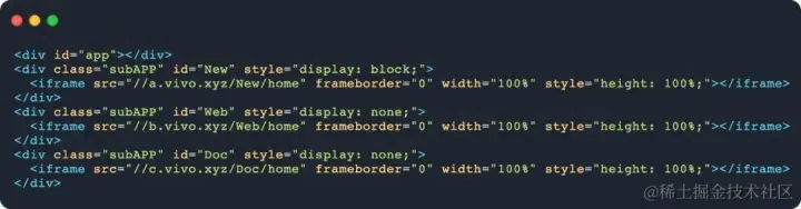 在前端静态页面中预留子应用dom节点,如下图 所示,每一个div有唯一id,代表一个预制子应用。同时该id对应子应用路由pathname,如New对应/New/*路由,即以New开头的路由全部对应id为"New"的子应用。