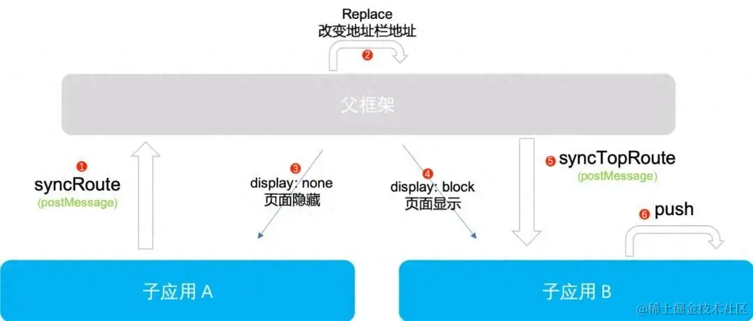 如/New/b 切换到/Web/c,其pathname结构不一致。子应用先切换路由,随后发送syncRoute消息给父框架,父框架使用replace方法改变浏览器地址栏,同时将应用A隐藏起来,并发送消息到子应用B中。子应用B获得消息后修改其本身路由。