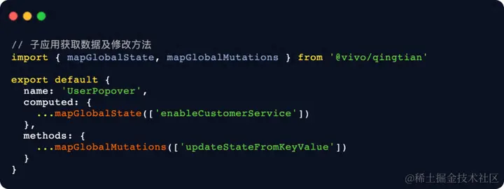 子应用通过类vuex似的 mapGlobalState 方法可以获取父应用store中数据,同时该数据为响应式,数据变更可触发UI重新渲染。