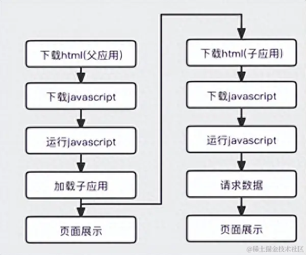 基本上所有的微前端框架都需要先加载父框架,再加载子应用,都要经历如下图的流程。整个流程是串行的,相同流程需要走两遍,也就比普通的非微前端框架要慢1倍左右,直接影响了用户体验。