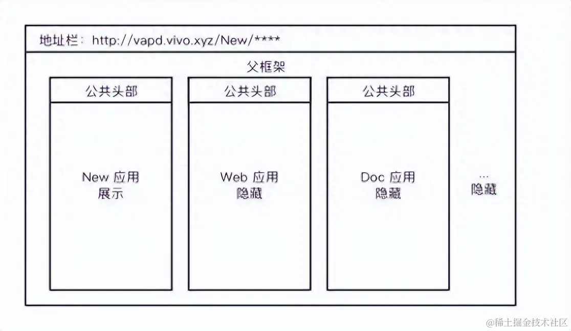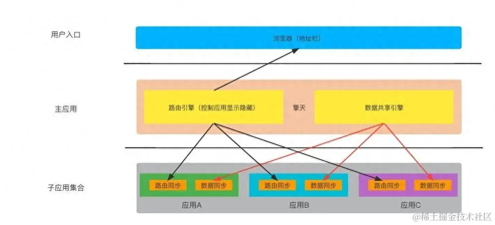 擎天框架架构分为三层,分别是用户入口(浏览器地址栏),主应用层以及子应用集合层。