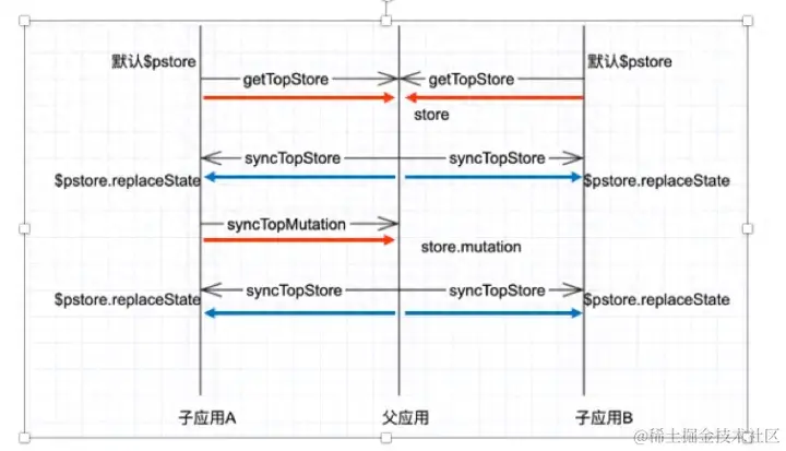 系统加载时子应用通过getTopStore方法可以获取store中数据,并赋值到子应用$pstore中,从而获得数据响应式等能力。