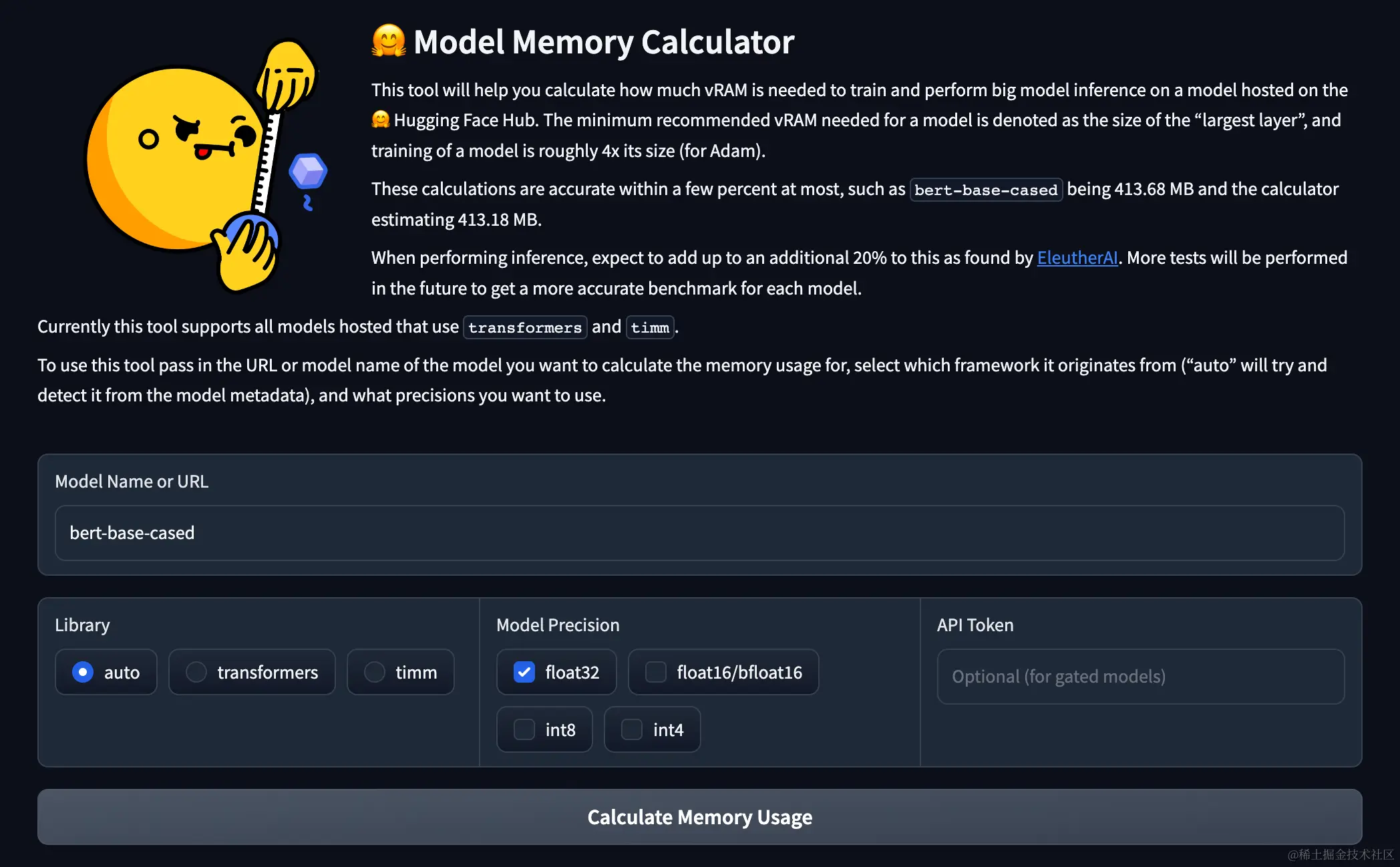 模型显存计算器 (Model Memory Calculator) 工具,旨在帮助大家计算在 🤗 Hub上训练或运行大型模型所需的 vRAM(显存)。这个工具能在百分之几的误差内估算模型的显存需求。