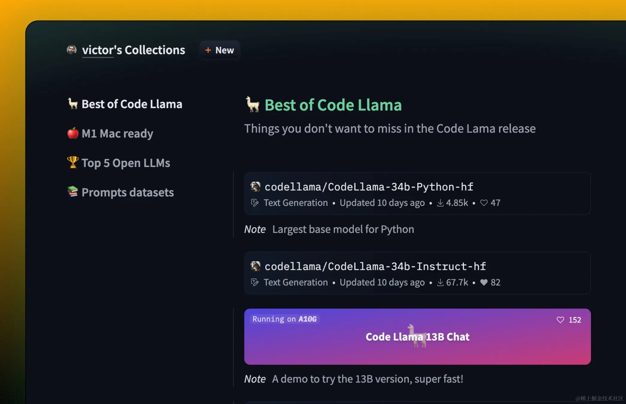 现在你可以把任何你喜欢的模型 / 数据集 / Space 应用等按照自己的喜好进行分类整理和收藏。这个功能不仅对个人账号开放,同时对 Hub 上的组织账号也同样开放,Collection 会显示在个人或者组织的资料页面上,快去试试看吧!