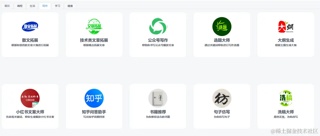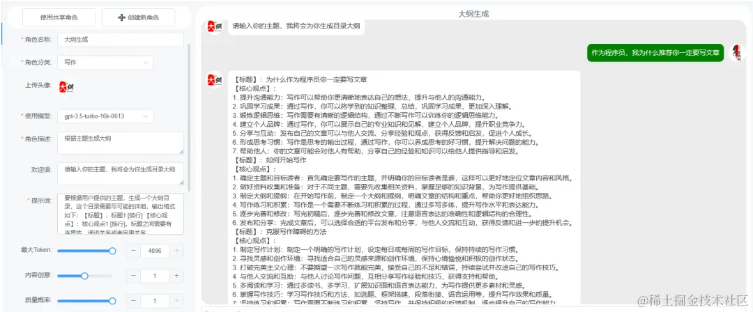 什么是分阶段使用呢?比如,标题你可以利用生成标题的角色来写,大纲用另外一个角色,最后拿着大纲再让其他角色进行拓展补充。如上图所示,有专门用来选题的,专门用来大纲乘车的,有文章拓展的等等。