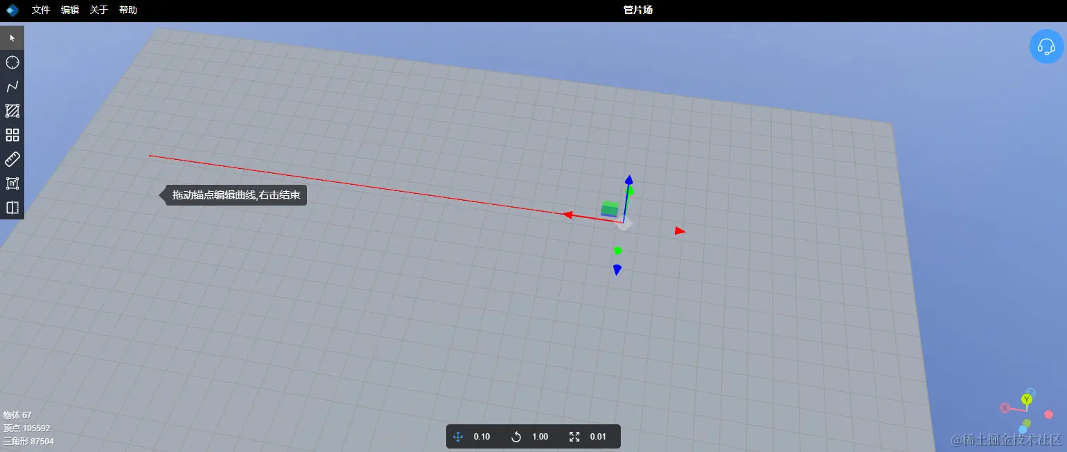 首先介绍下继续编辑功能:选中模型,点击右侧面板的编辑按钮,场景中会提示“拖动锚点编辑曲线,右键结束”,我们尝试拖动锚点