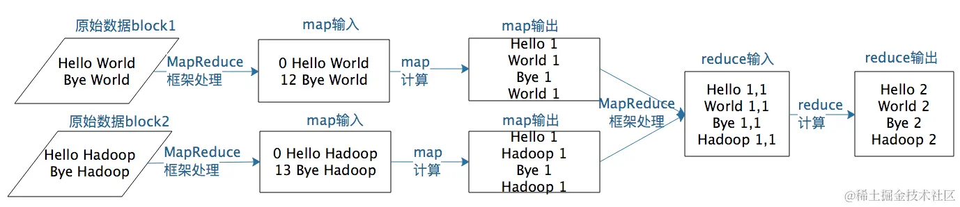 - 分为map和reduce两个阶段。