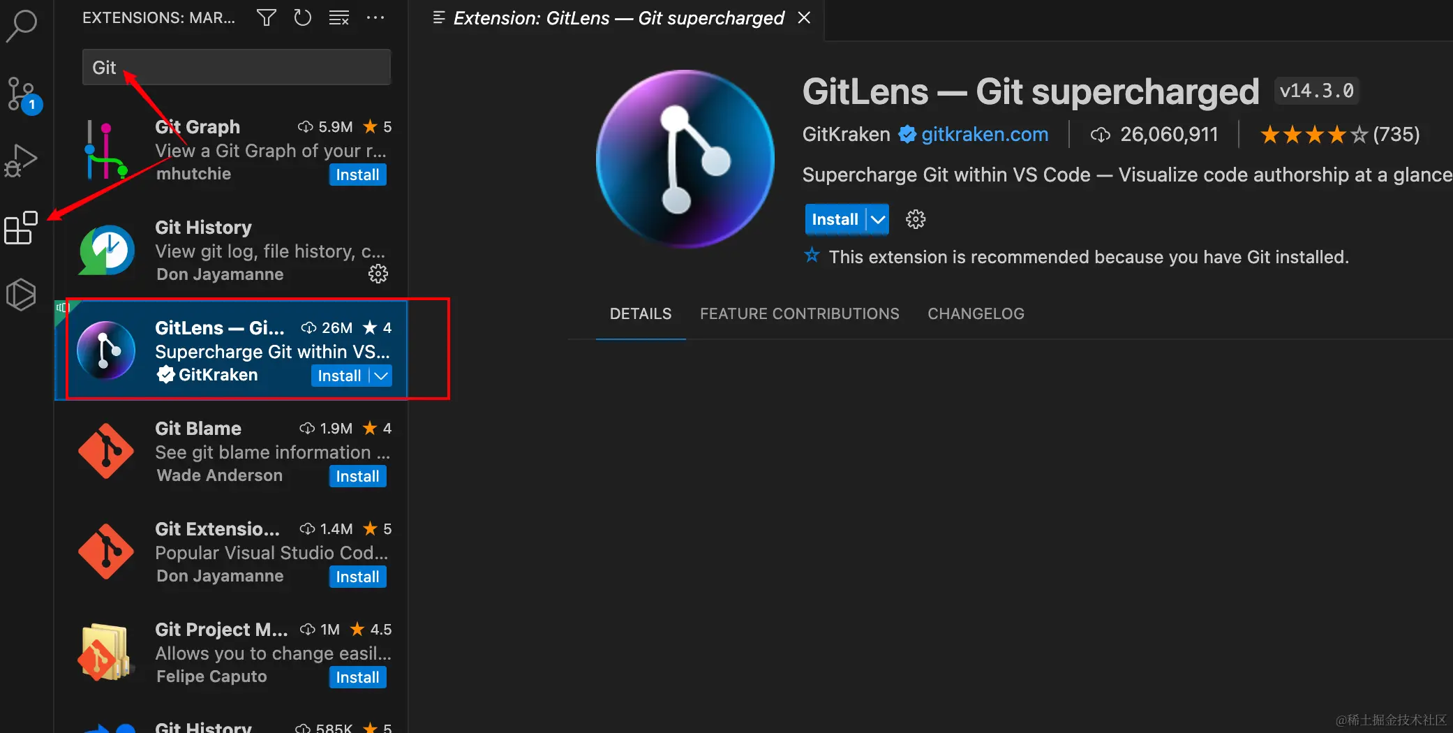 我想多数人不喜欢在黑白的窗口敲命令,我们可以通过VS Code 扩展来增强使用 Git,我推荐自己常用的一个Git插件为GitLens,安装如下图:
