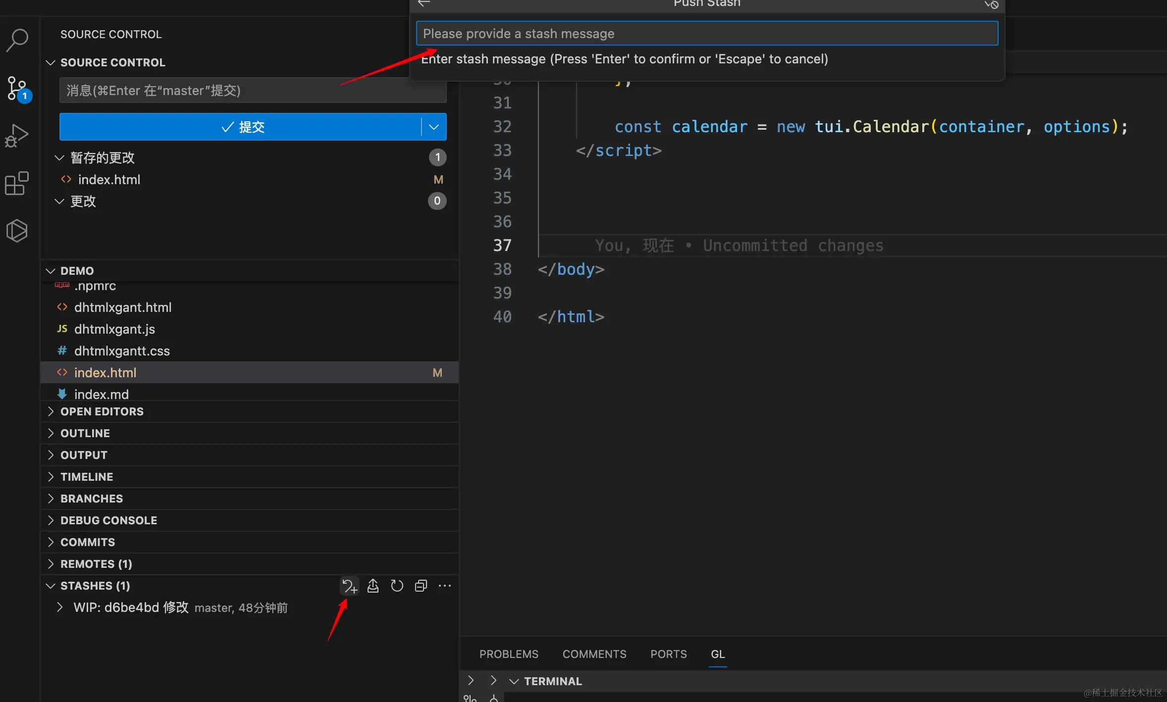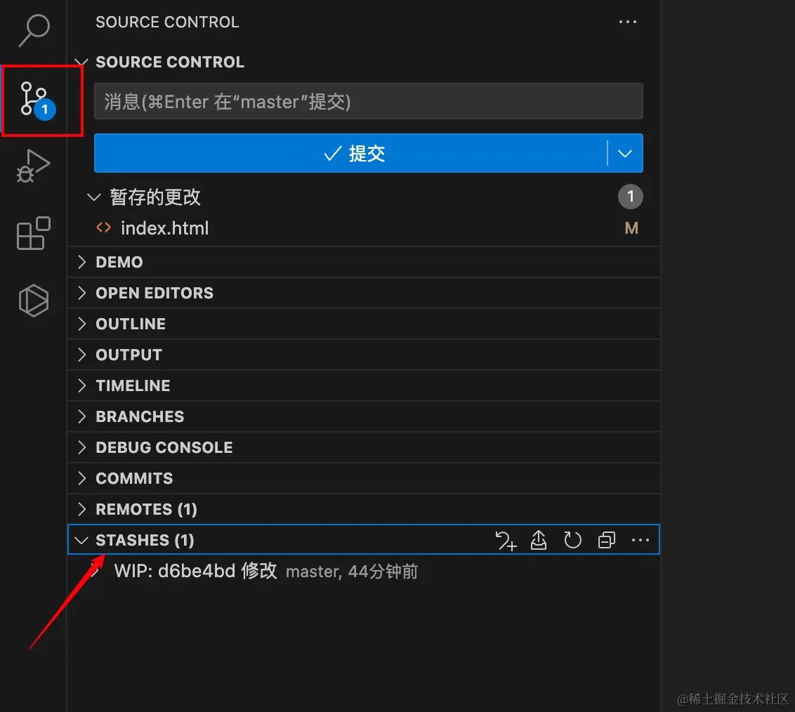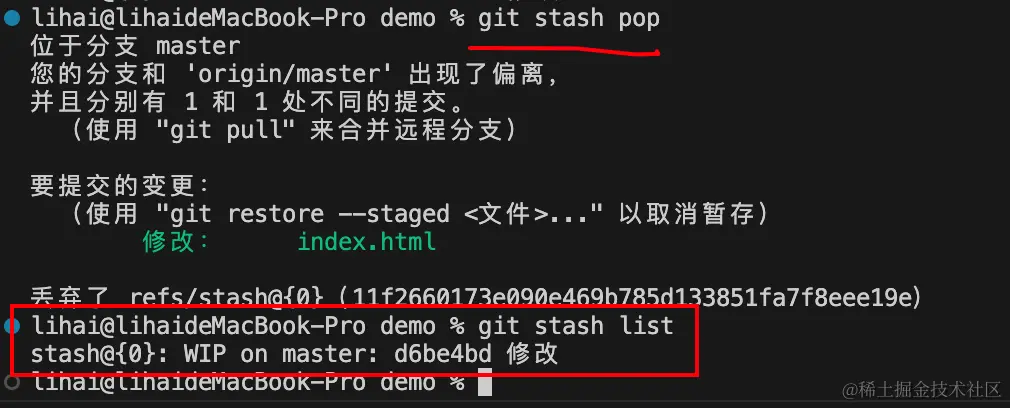 现在我们临时保存index.html修改状态git stash,储存记录中就会多一条记录: