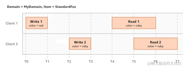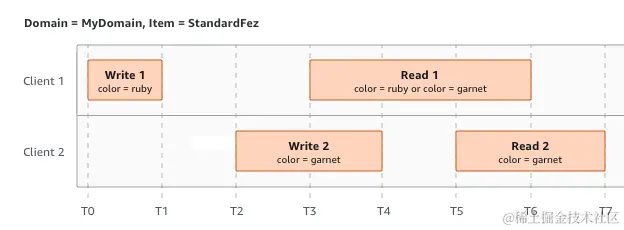 在下一个示例中,W2 不会在 R1 开始之前完成。因此,R1 可能返回 color = ruby 或 color = garnet 。但是,由于 W1 和 W2 在 R2 开始之前完成,因此 R2 返回 color = garnet 。
