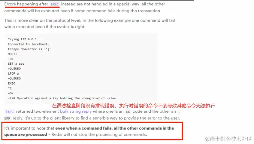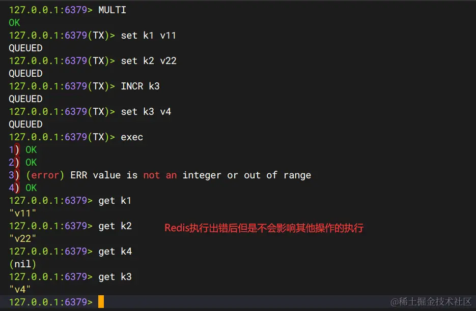 一个语法出错,全体连坐。如果任何一个命令语法有错,Redis会直接返回错误,所有的命令都不会执行