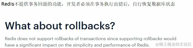 | 3.不保证原子性 | Redis的事务不保证原子性,也就是不保证所有指令同时成功或同时失败,只有决定是否开始执行全部指令的能力,没有执行到一半进行回滚的能力 |