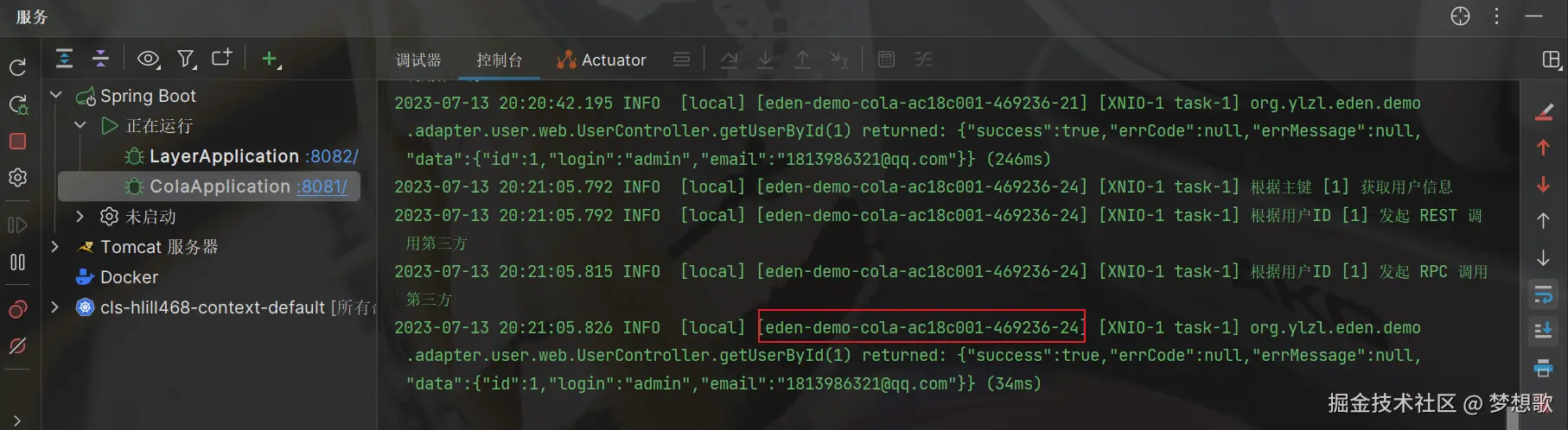 启动您的项目,调用接口,查看控制台输出的日志内容,红圈中就是 CAT 的链路ID。