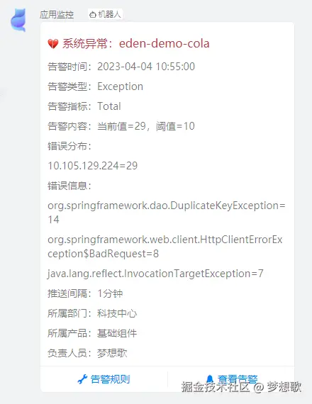支持邮件、钉钉、微信、飞书机器人推送。不需要额外实现告警接口,直接开箱即用,您只需要在后台配置相关的 Token 即可。如下图,触发告警后,钉钉将推送相关信息,您可以点击