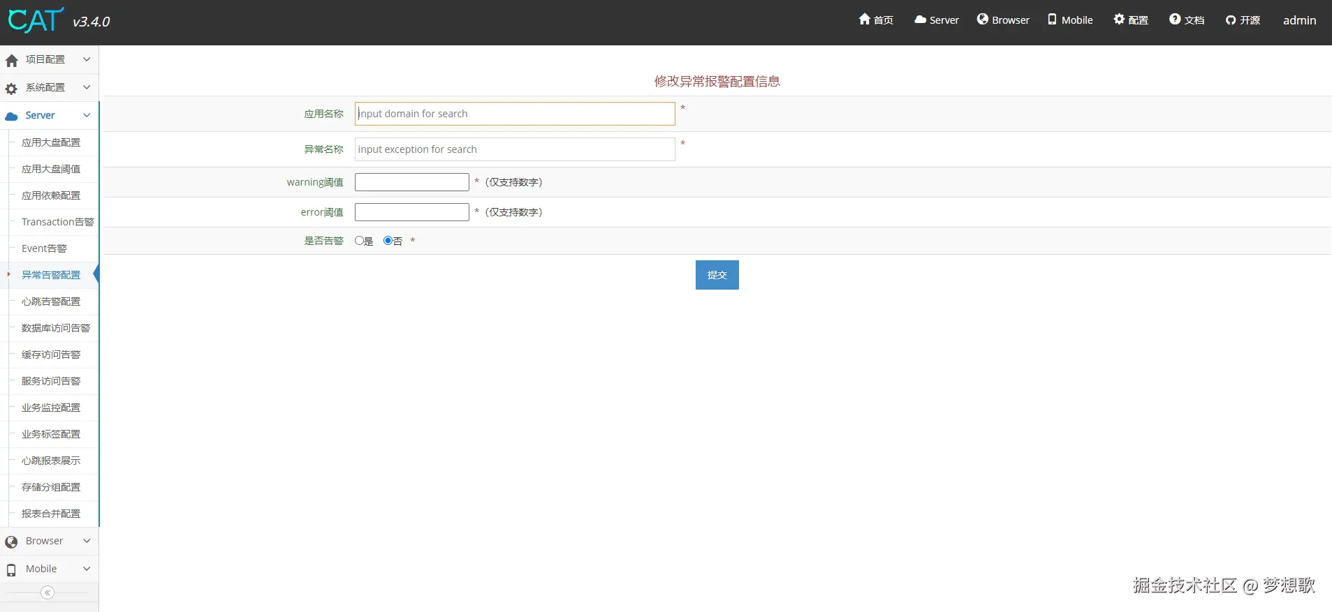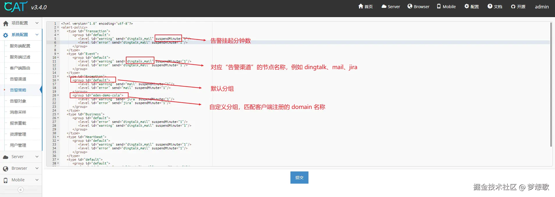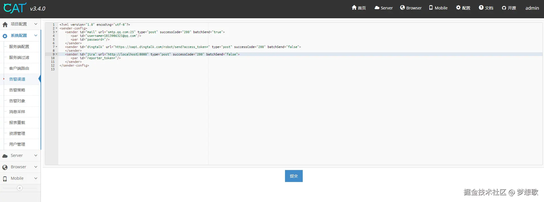 设置 系统配置 的 告警策略,即 CAT 埋点达到告警阈值时发送的接收对象,例如 dingtalk、mail、jira,如下图: