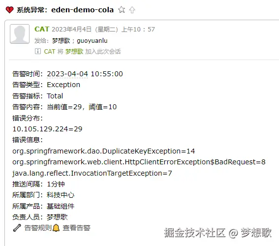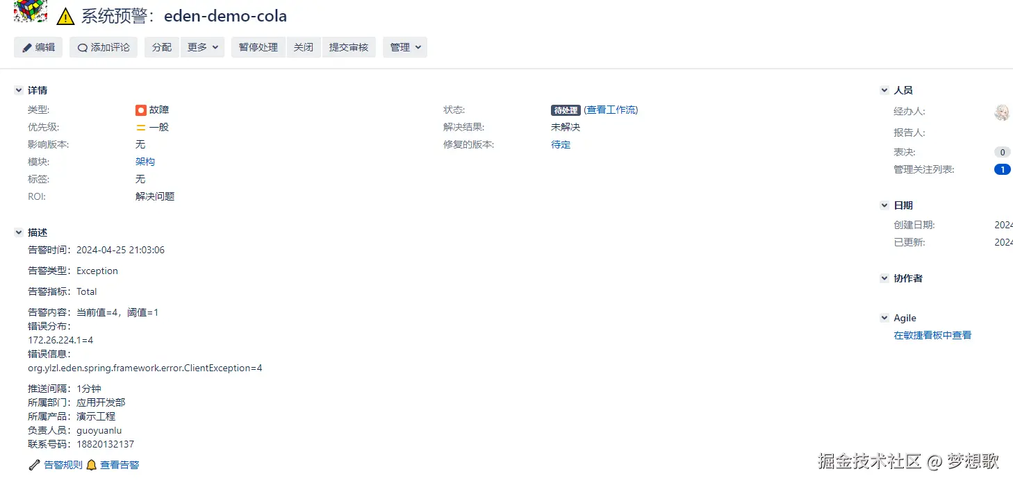 笔者设置了所有异常出现 5 次时发送告警,10 次时发送告警。达到这个阈值时,邮件会发送到 告警对象 设置的接收对象,Jira Software 会创建一个故障,钉钉会发送告警通知: