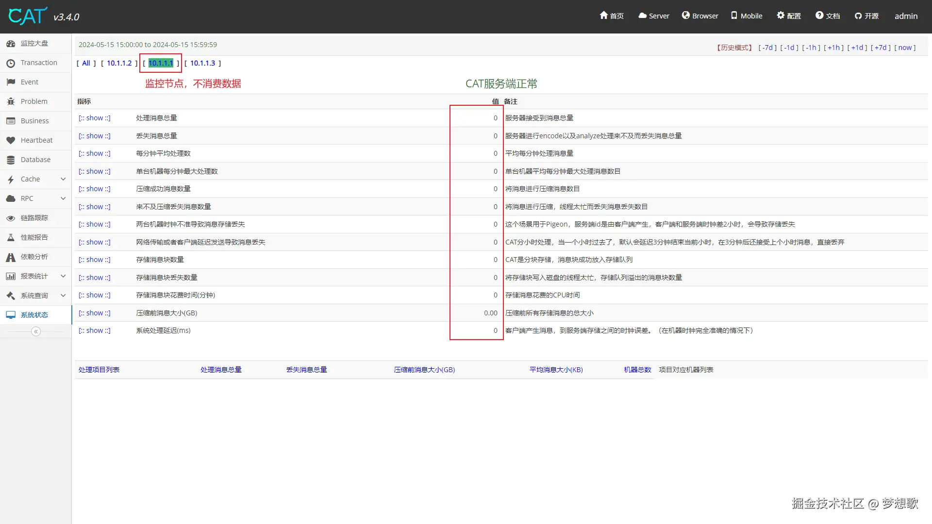 配置完成后,查看首页的系统状态,集群配置已生效,如下图,监控节点只负责控制台的数据展示和告警通知,不消费客户端的数据。
