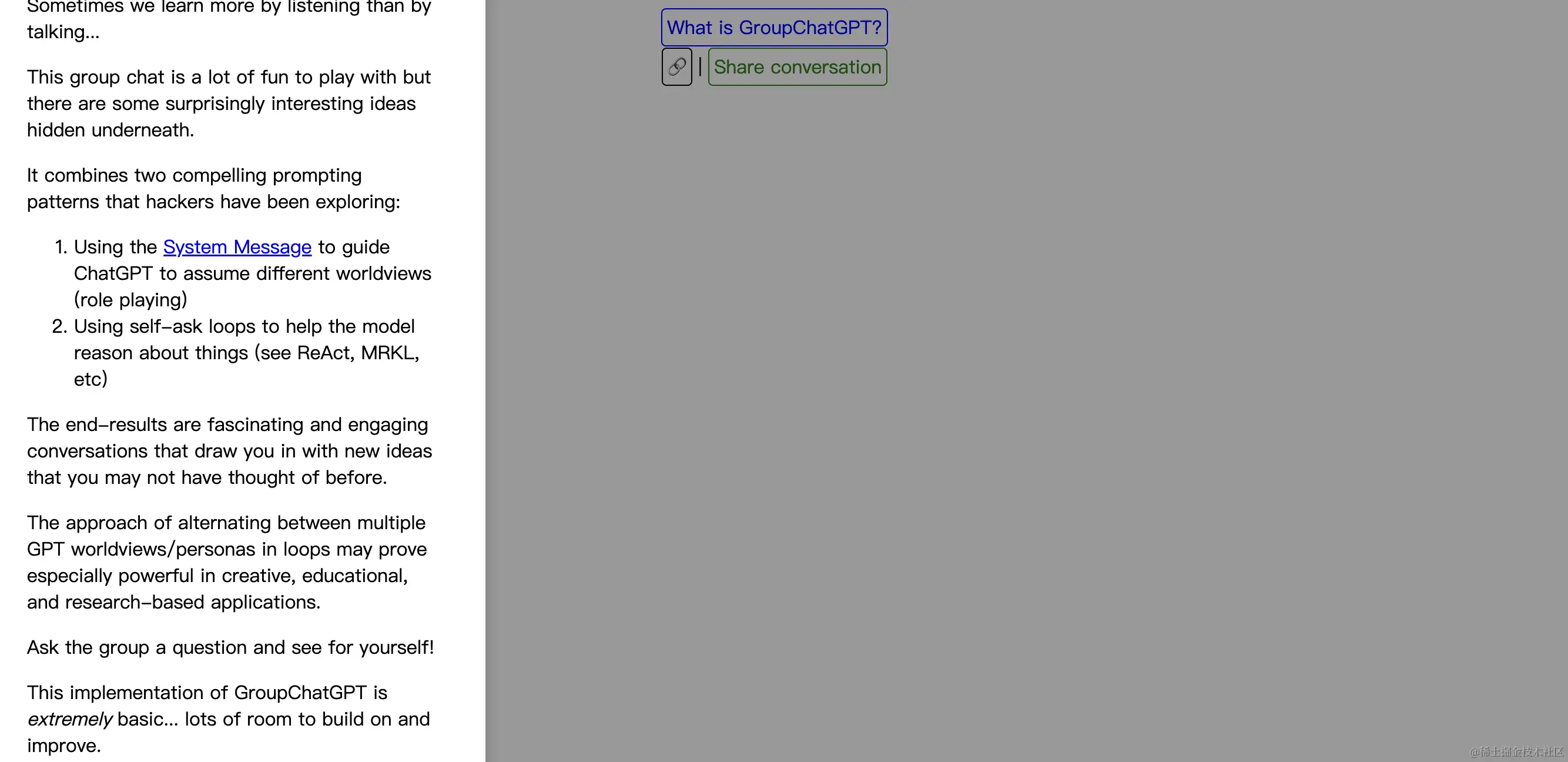 将 ChatGPT 从尴尬的1:1对话演变成与您最喜爱的角色一起参与的熟悉的团体聊天。机器人之间展开的一场语言大战,这个群聊非常有趣,但是里面隐藏着一些令人惊讶的有趣想法。在创意、教育和基于研究的应用中,循环在多个GPT世界观/人格之间交替的方法可能特别有效。