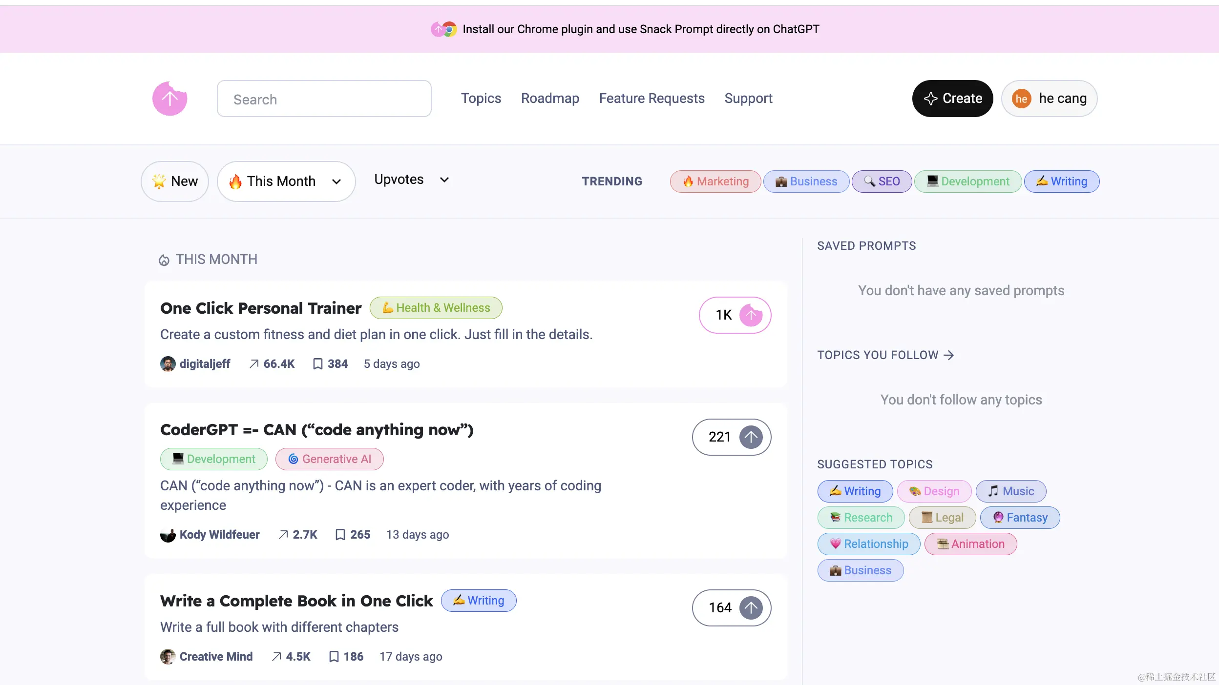 SnackPrompt:作为 Prompt 领域的 GitHub,旨在搭建一个创意无限的平台。在这里,您可以自由地创建和分享您的 Prompt,亦可根据周、月维度查看热门 Prompt,并收藏。