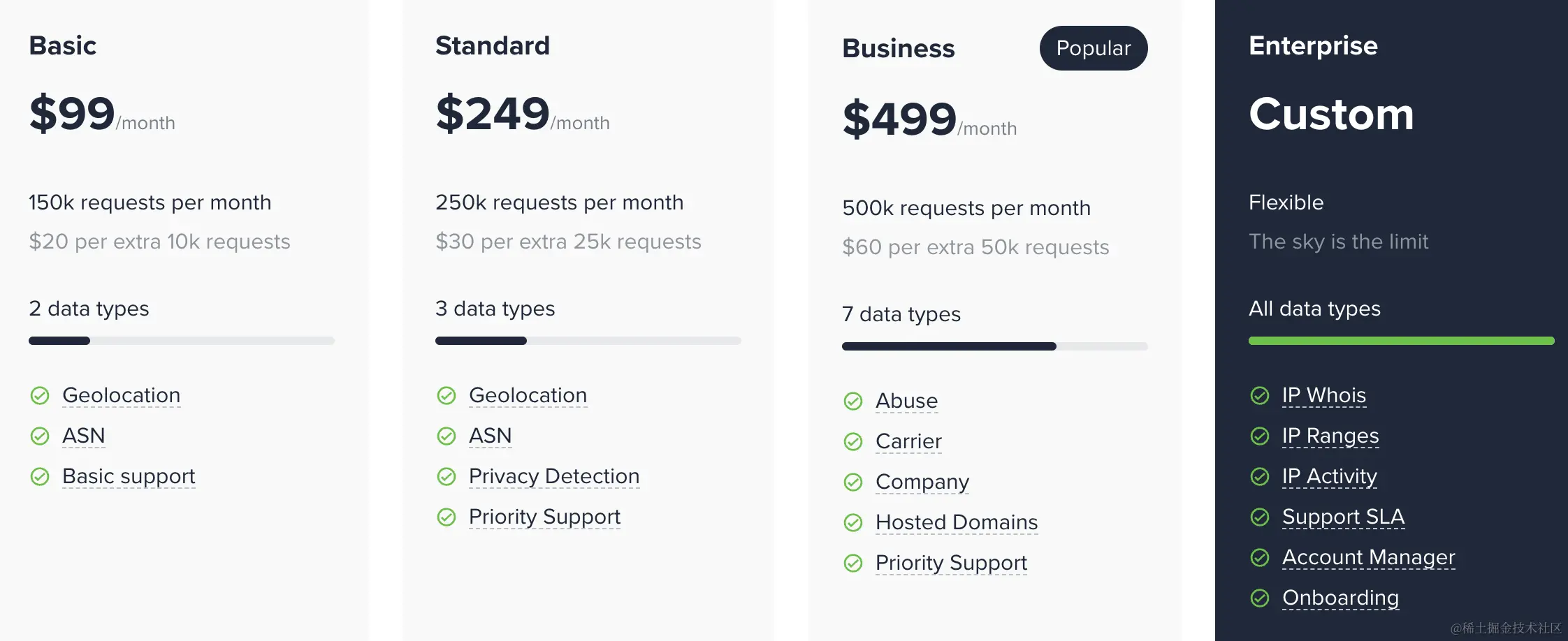 可以看到该工具还提供了免费套餐,一共50000次/月的请求额度。对于很多刚起步的小产品,或者个人博客等独立产品来说,这个免费额度,基本上也够用了。刚好有这个需求的小伙伴,可以来试试。其他付费套餐,这里就不介绍了,感兴趣的小伙伴可以去价格页查看。