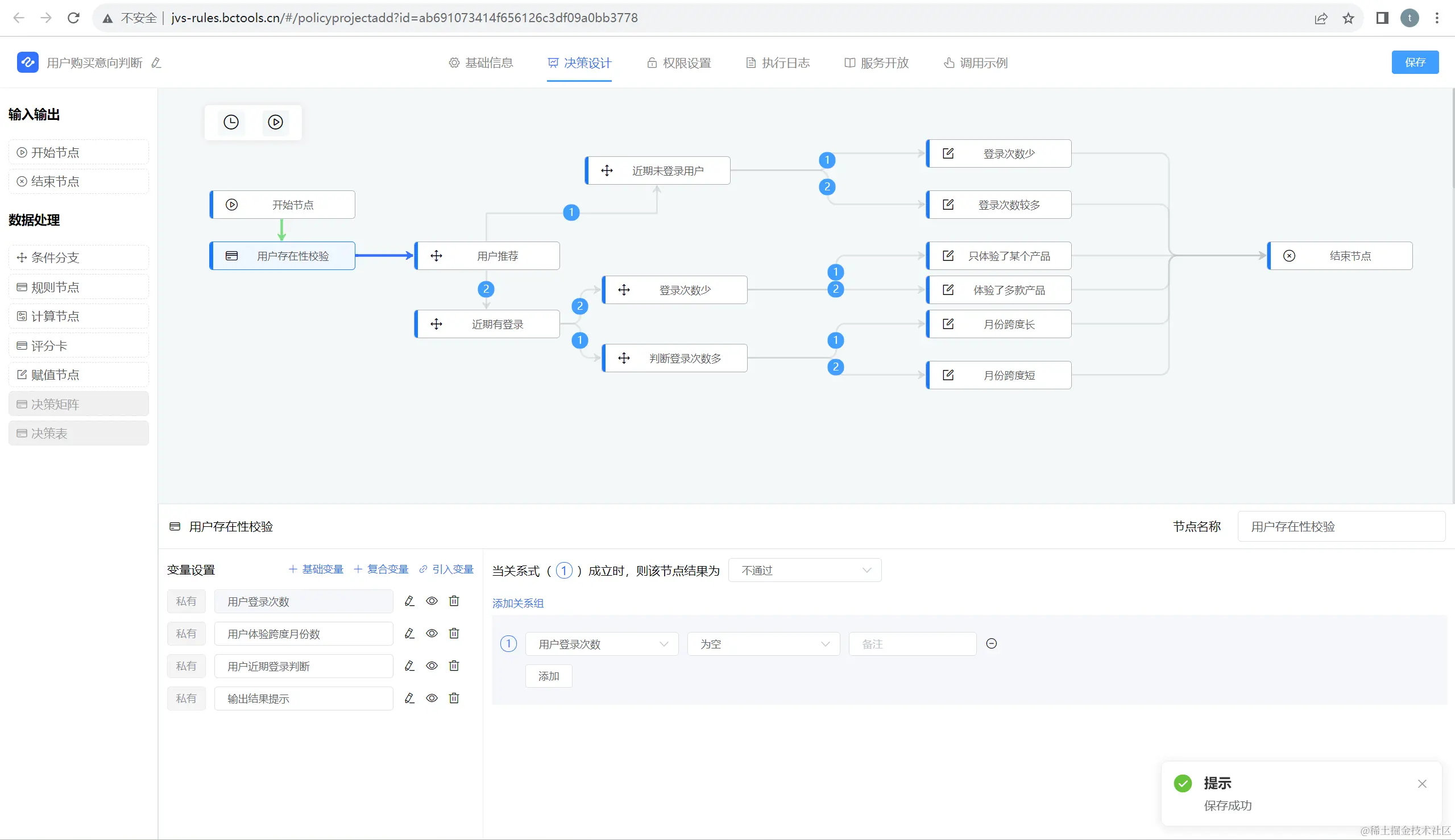 - 设计整个决策的数据因子(变量),变量支持单一变量,也支持复合变量(数组对象),通过公式映射、可视化加工,把数据转为为场景中所需要的决策因子