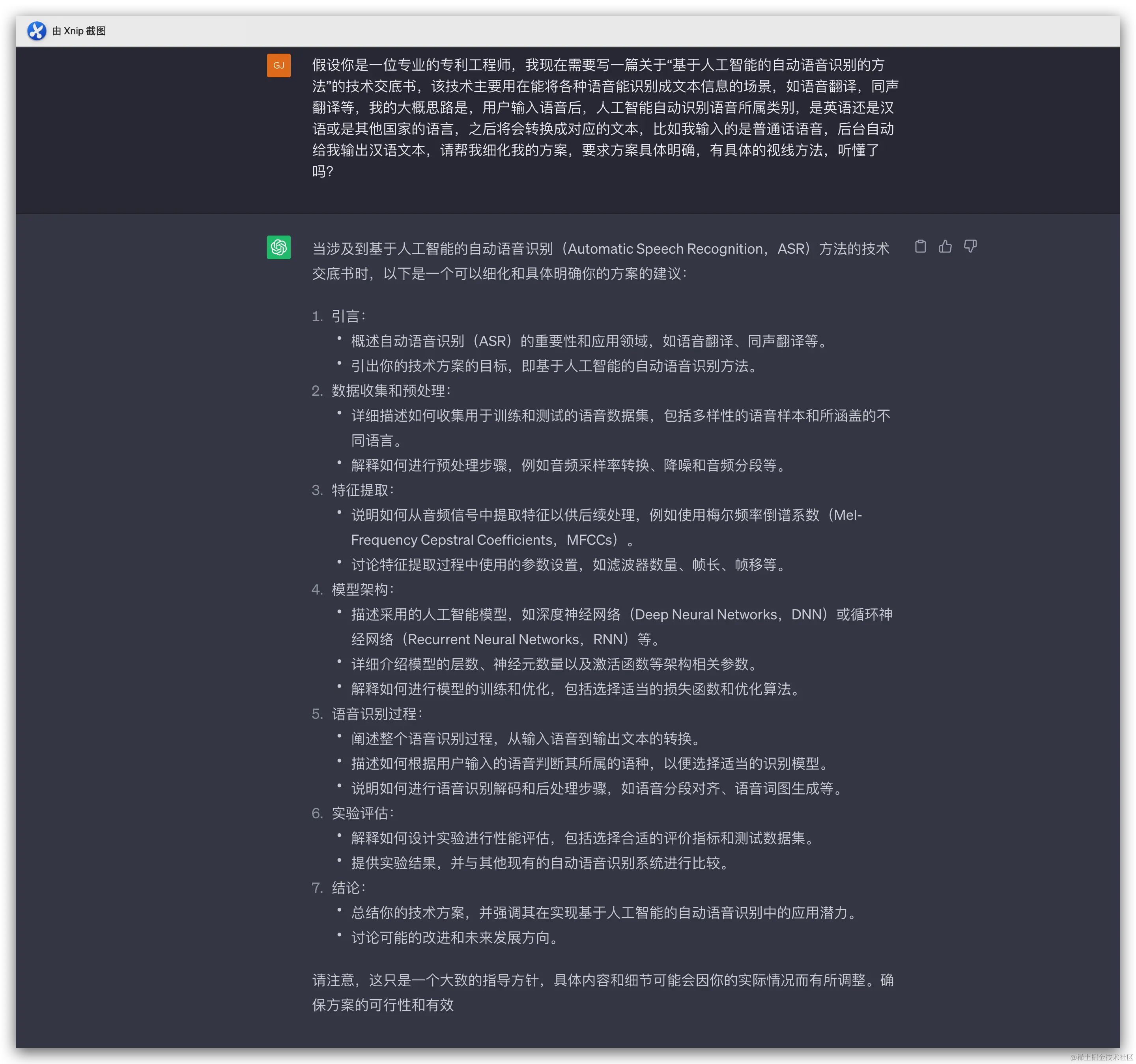 ChatGPT 可以很好的辅助我们进行专利技术交底的编写,合适的 prompt 有助于对技术方案进行详细的描述,我们首先要有该专利的大纲,也就是脑子里要想明白,我这个专利具体实现方案大概是怎样的,具体的细化我们可以直接问 ChatGPT,以下是一些例子:
