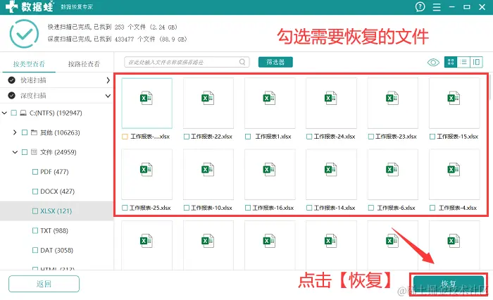 5检查需要恢复的文件都勾选上之后,可以点击 【恢复】 ,在弹出的界面中选择文件恢复后的保持位置,注意要与原先的位置有所区别。