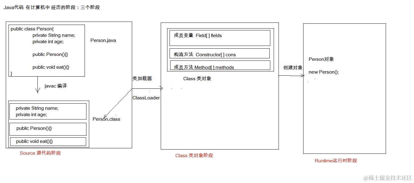 对于每一种类,Java 虚拟机都会初始化出一个 Class 类型的实例,每当我们编写并且编译一个新创建的类就会产生一个对应 Class 对象,并且这个 Class 对象会被保存在同名 .class 文件里。当我们 new 一个新对象或者引用静态成员变量时,Java 虚拟机(JVM)中的类加载器系统会将对应 Class 对象加载到 JVM 中,然后 JVM 再根据这个类型信息相关的Class 对象创建我们需要实例对象或者提供静态变量的引用值。