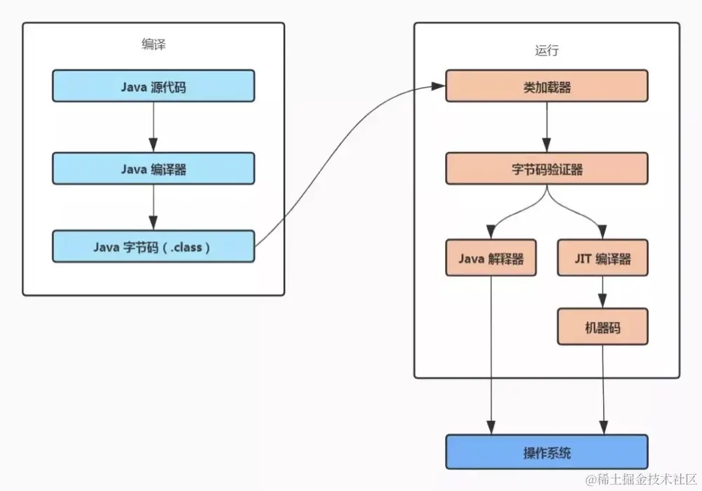Java 严格来说也是编译型语言,但又介于编译型和解释型之间;Java 不直接生成机器码而是生成中间码:编译期间,是将源码交给编译器生成 class 文件(字节码),这个过程中只做了翻译的工作,并没有把代码放入内存运行;当进入运行期,字节码才被 Java 虚拟机加载、解释成机器语言并运行。