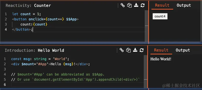 可以看出来模板代码非常少,比较符合使用直觉,更多的demo可以去官方的 playground 尝鲜