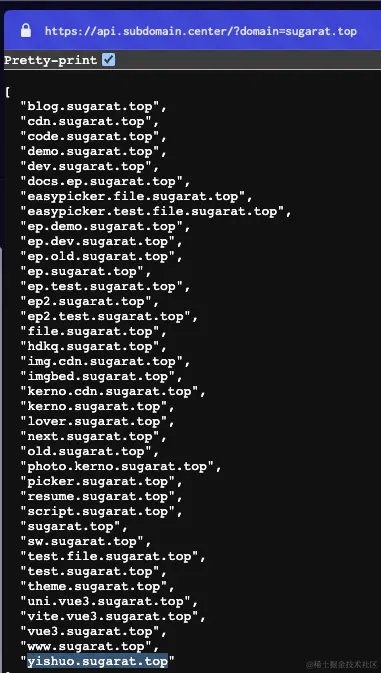 比如查询笔者的个人域名sugarat.top的子域名信息,只需要访问