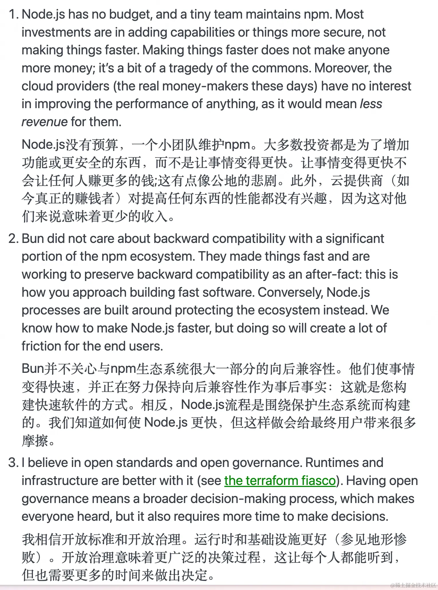即兴奋又失望,根据作者的经验,它不是一个直接的 Node.js 替代品,许多内部细节都有所不同。还探讨了为什么 Bun 比 Node.js 快?