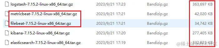 - 再者就是 LogStash 其实是一个 Java 程序,对 CPU、内存、IO 的占用较高,因此 Elastic NV 也就是官方推出了使用 Go 语言写的 Beats 这一轻量级采集器,进行数据的采集,我们可以从文件大小中看出: