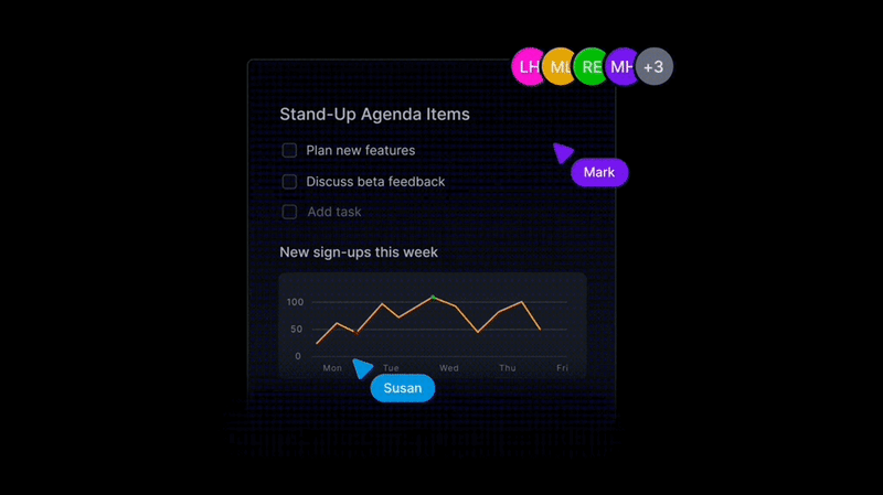Spaces SDK 随附一套直观的 API,可让您在数天内构建头像堆栈、实时光标、成员位置和组件锁定等实时协作功能。每个应用程序接口都针对特定用例进行了优化,从而减少了集成工作。