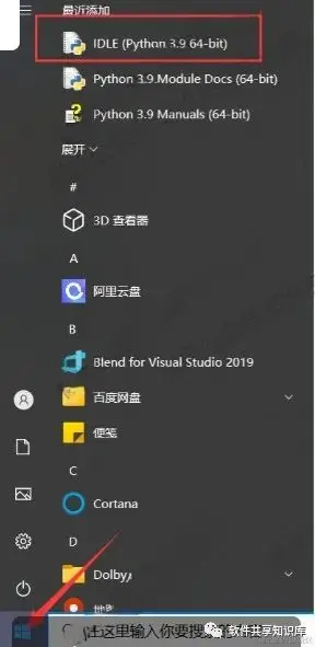 9.在开始菜单栏找到IDLE (Python 3.9 64-bit)双击运行打开软件