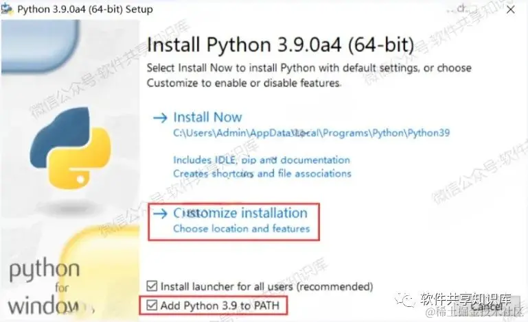 4.勾选Add Python 3.9 to PATH,点击“Customize installation”。