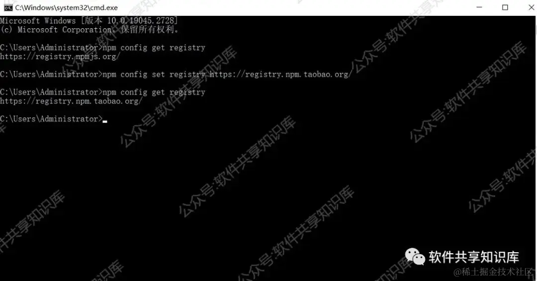 8.查看node的npm默认镜像,如果为以下镜像,需要改成taobao镜像,影响包的下载速度。